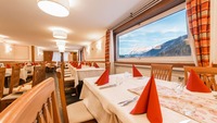 Il panorama che si gode dalle vetrate della sala ristorante spazia dal paese fino alla cima del Sasso Croce. Un ricco buffet servito e caffetteria espressa per la colazione. A cena il menù è servito al tavolo e viene arricchito da un buffet di sfiziosità, crudità  e dolci, dove potrete apprezzare i piatti della tradizione locale e internazionale.